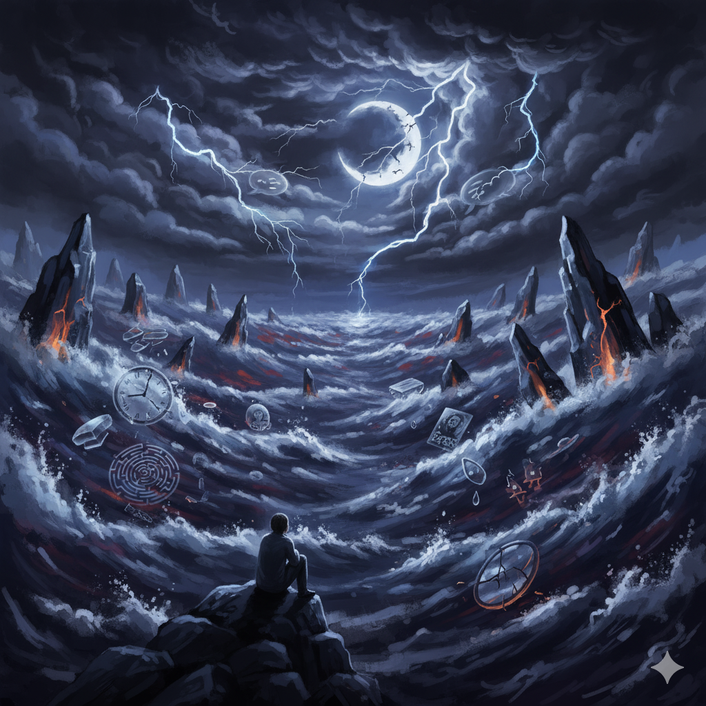- 割れた鏡の破片のようなもの: これは、自己認識の断片化や、自分自身を見失いかけている状態を表しています。心の時化の中では、自分というものがはっきりと見えなくなることがあります。