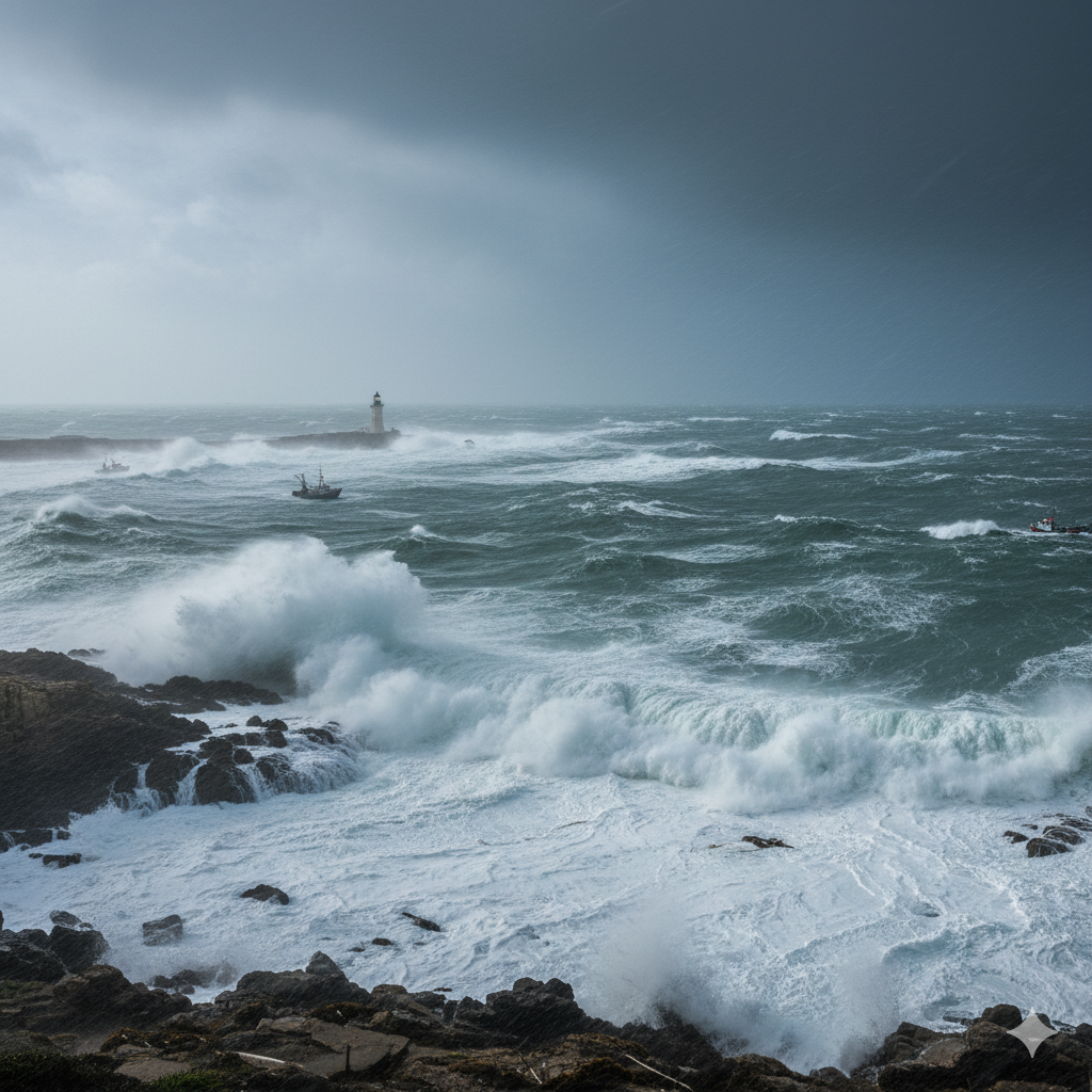 はい。確かにシケってますね。キーワードにはない船や灯台も描かれています。どちらも荒れた海と関係が深いものです。