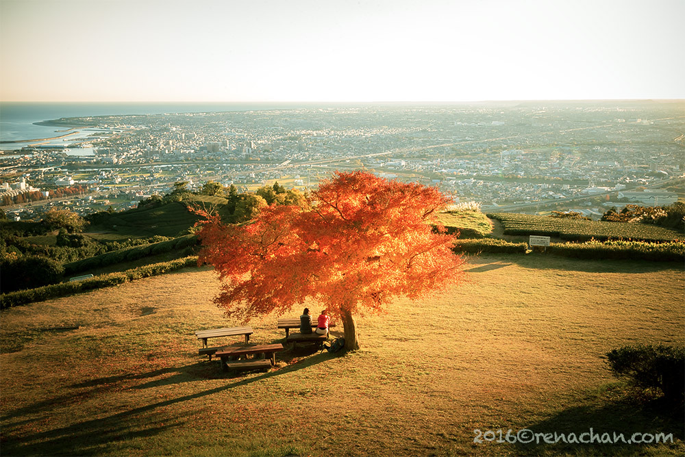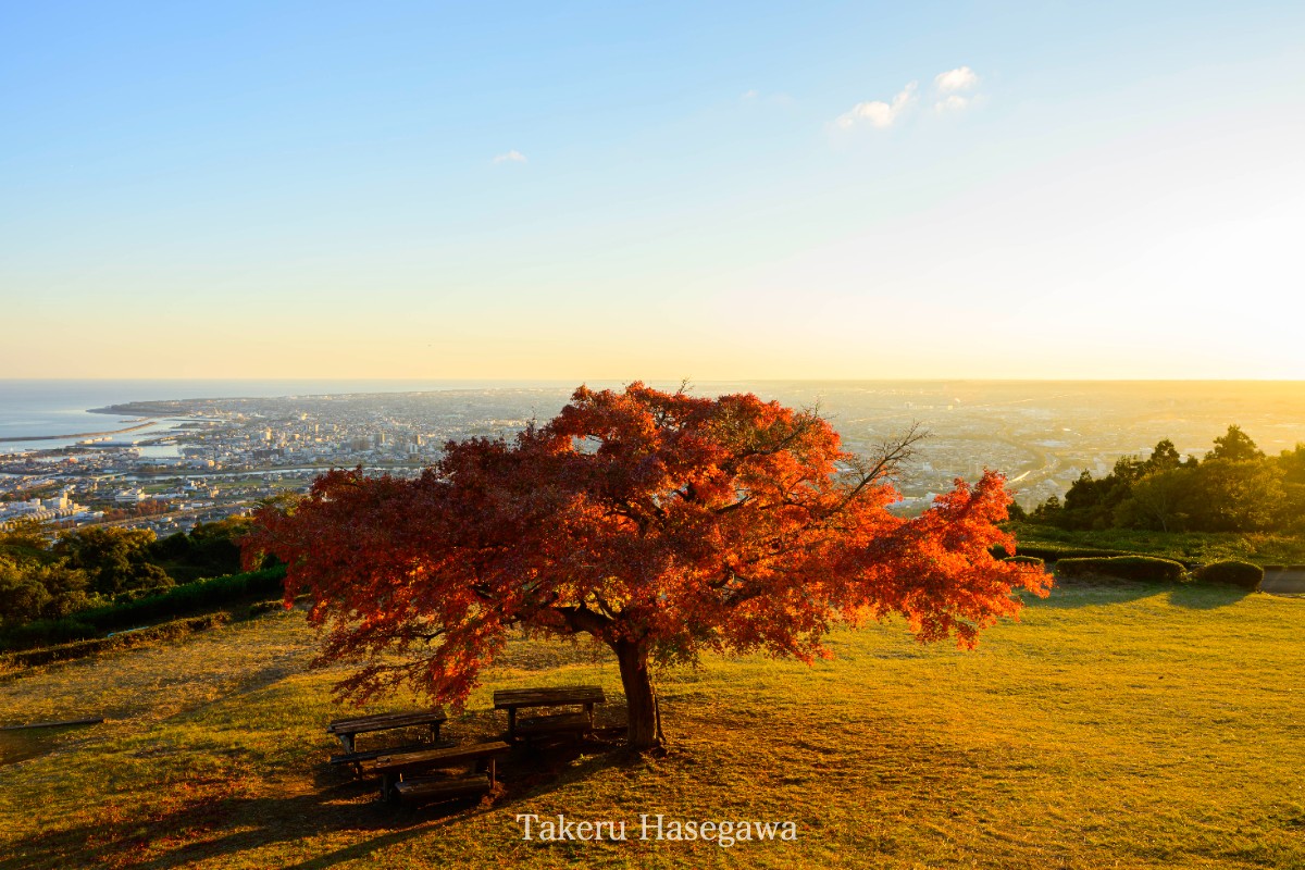 どちらも同じ一本の紅葉の木と、その向こうに広がる街並みと海を捉えてるけど、撮る人の視点や表現したい空気が全然違ってて、むしろそれがすごく面白い!