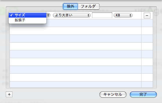 除外設定はサイズと拡張子、フォルダ指定の3つのみ。もう少し選択肢があると便利なのだが…。