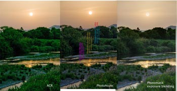 On the left : One shot (ACR), Center : PhotoAcute (High Dynamic Range preset) , Right : Photomatix (exposure blending)